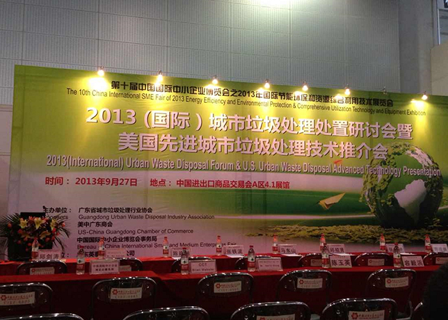 2013年9月27日下午,由广东省城市垃圾处理行业协会、美中广东商会和中国国际中小企业博览会事务局联合主办的2013(国际)城市垃圾处理处置研讨会暨美国先进城市垃圾处理技术推介会,在2013中国(国际)中小企业博览会主会场——进出口商品交易会展馆(琶洲)A区4.1馆--节能环保主题展馆举行。我司在展馆设置了展位,向全国各地的同行及采购商展示了我司的工艺新技术,同时,我司也参与了研讨会及技术推介会,与中外同行一起围绕城市垃圾处理的技术及其带来的商机进行了热烈的交流和讨论。